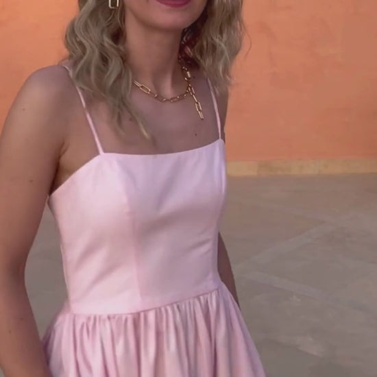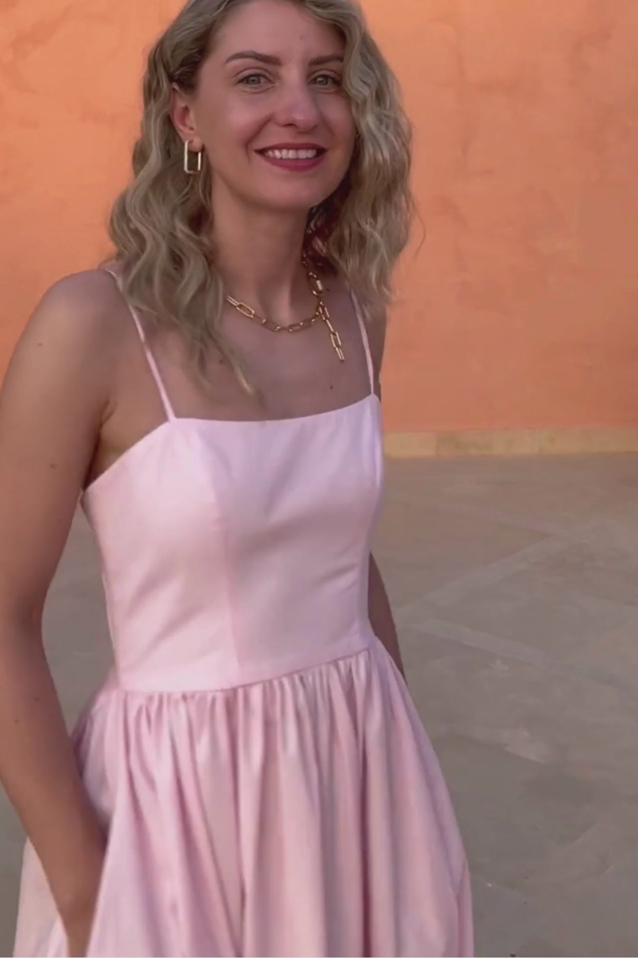 An anthem to movement and light, the Aria dress dances with every step, a wearable moment of becoming as the sun you carry within meets baby‑pink serenity.